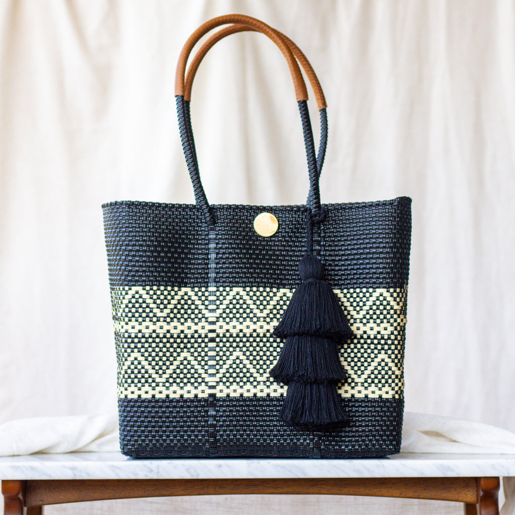 Handwoven Oaxaca Tote Bag - Black and Tan with Leather Handles