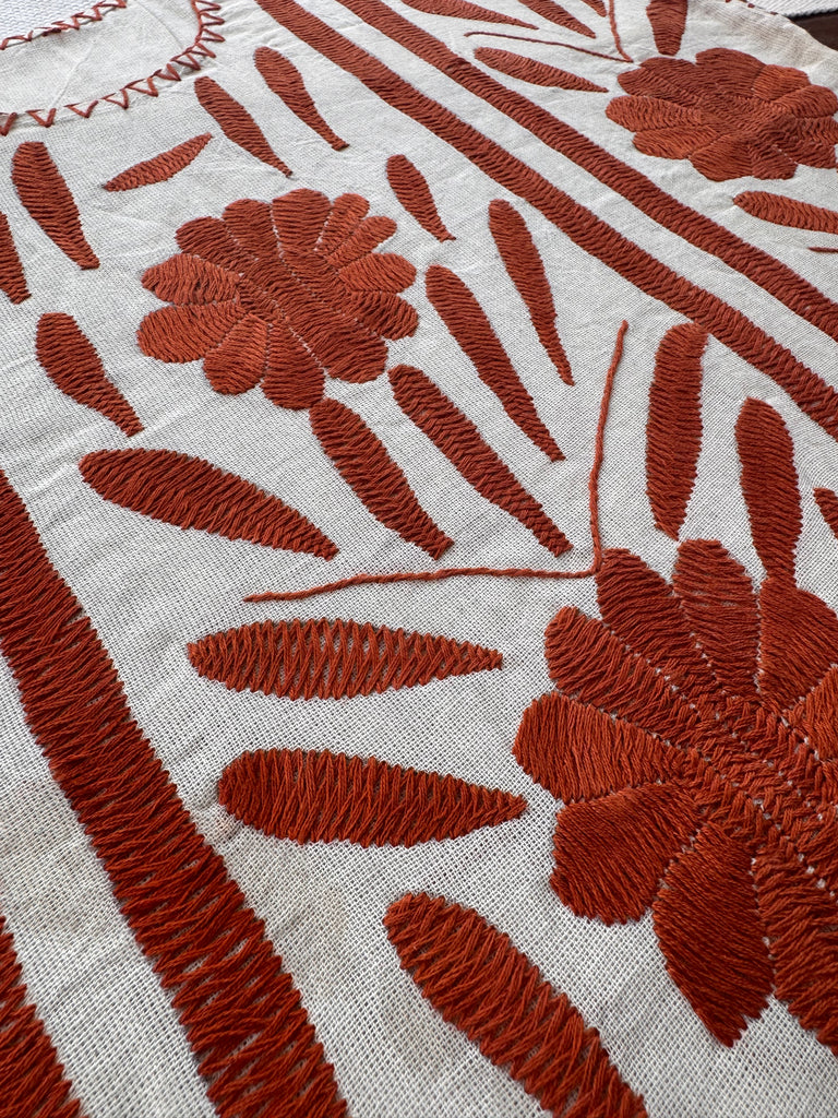 Introducing our exquisite Palmita Mexican blouse, meticulously hand-embroidered in Jalapa de Diaz, Oaxaca, and artfully crafted with a stunning pattern on organic cotton Manta fabric. Embrace its loose-fitting style, offering endless styling potential, available in two sizes: